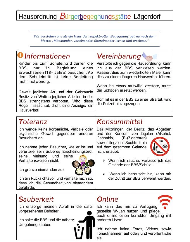 Die Bürgerbegegnungsstätte (BBS) gilt als Treffpunkt für alle Bewohner/innen in und um Lägerdorf. Hier bietet sich genügend Raum für jede Generation. Zum gemütlichen Plausch mit den Nachbarn bis zum lustigen Spielen ist hier jeder Besucher herzlich willkommen.
