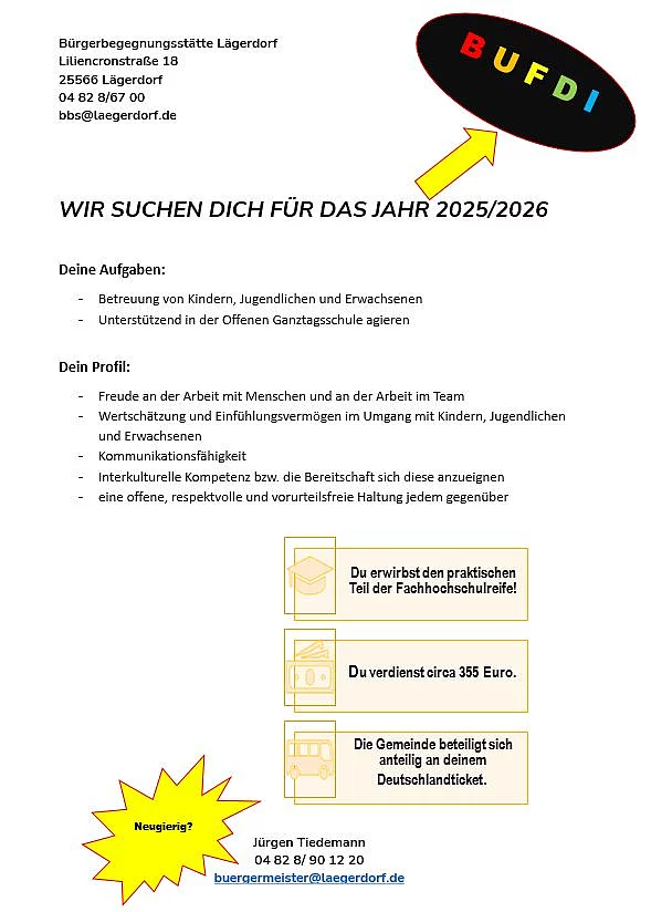 Wir suchen für das Jahr 2025/2026 eine/n BUFDI (m/w/d) - Weitere Informationen findest du hier.