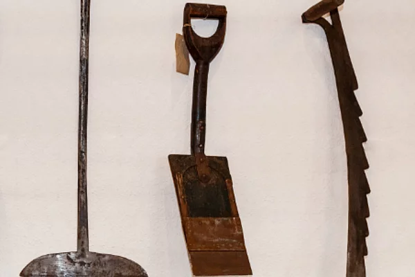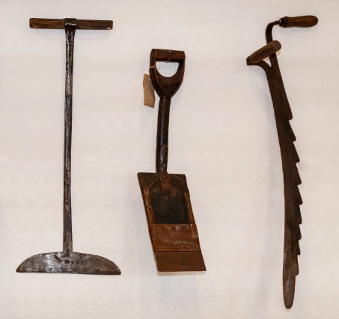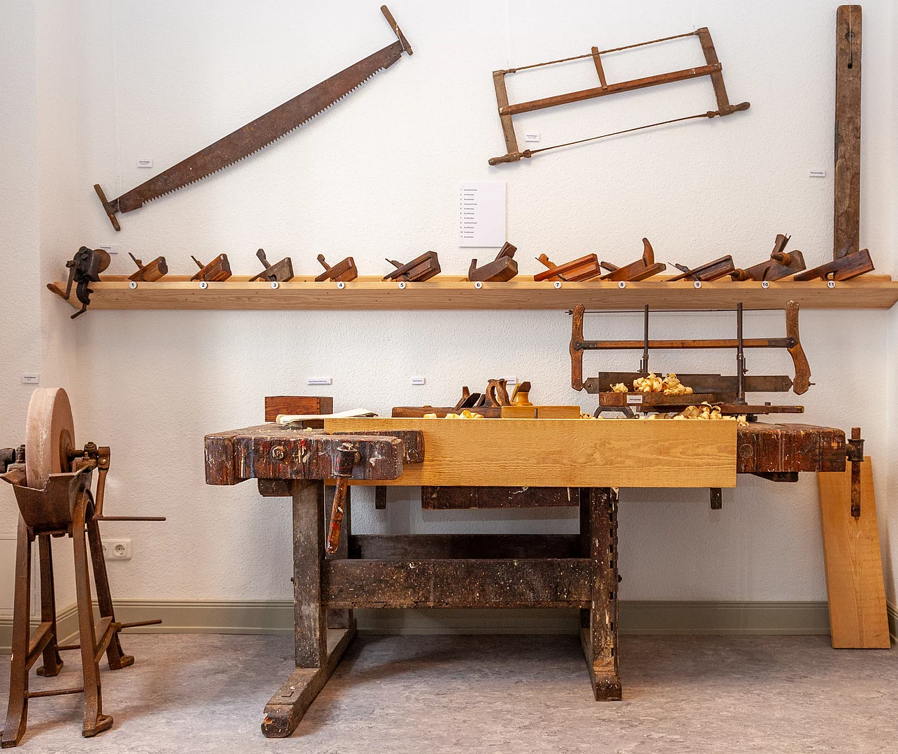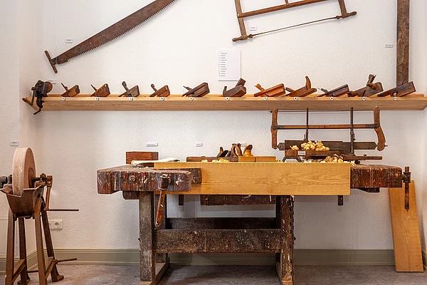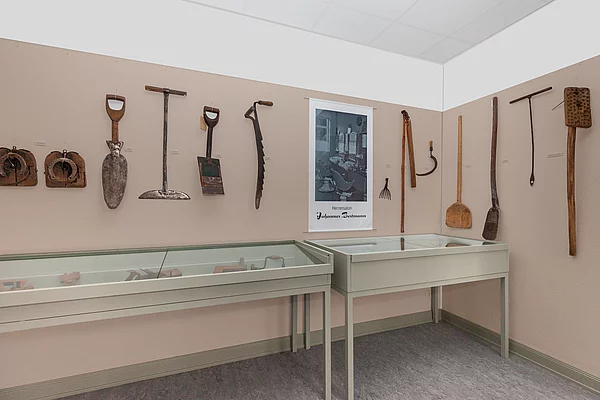 In einem weiteren Raum im Erdgeschoss befinden sich traditionelle Arbeitsgeräte aus verschiedenen Handwerksberufen und der Zementindustrie (z.B. Torfgeschirr, Einblick in eine Tischlerei, Schusterwerkzeug, Zementfass, Versandstempel).