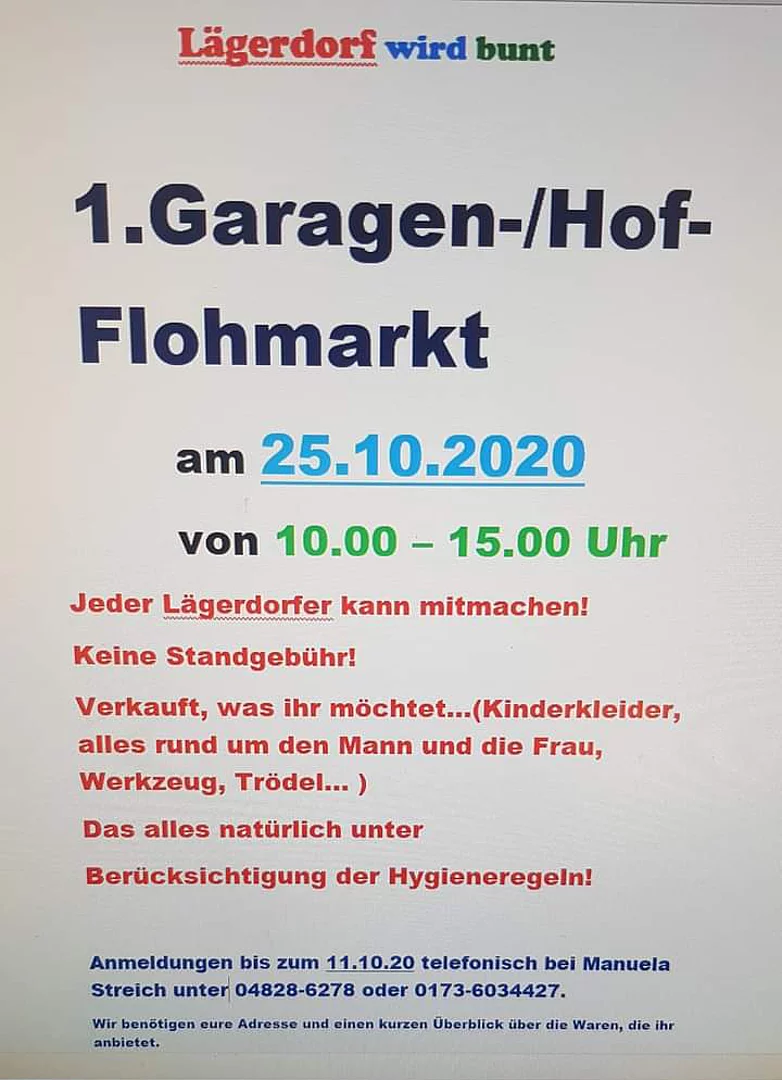 Zum ersten Mal findet in Lägerdorf ein Garagen- bzw. Hofflohmarkt statt. Jede(r) Lägerdorfer(in) kann mitmachen! Eine Standgebühr wird nicht erhoben. Verkauft werden kann alles, was man loswerden möchte (s. Flyer unter Downloads). Der Flohmarkt findet am Sonntag, dem 25.10.2020 in der Zeit von 10.00 bis 15.00 Uhr statt. Anmeldungen bis zum 11.10.2020 telefonisch bei Manuela Streich unter 04828-6278 oder 0173-6034427