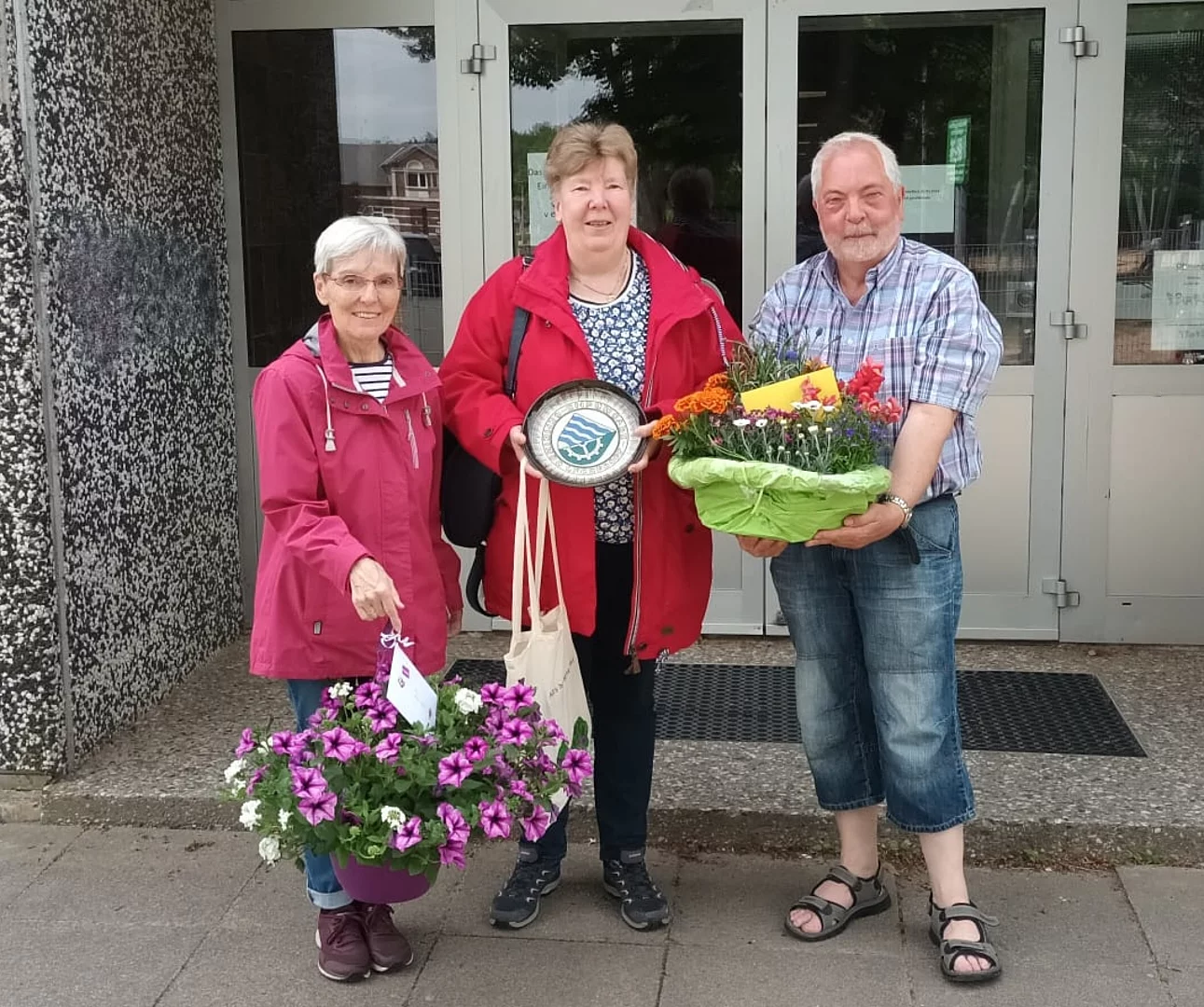 Nach fast 30-jähriger Tätigkeit für die Gemeinde wurde nun Frau Beate Kühl als Leiterin der Bürgerbegegnungstätte durch die beiden stellvertretenden Bürermeister(in) Renate Gromke und Ingolf Streich in den Ruhestand verabschiedet. Frau Kühl war in allen bishigen Standorten der BBS - in der Breitenburger Straße, dem Haus am Kamp und zuletzt im alten Grundschulgebäude - tätig. Mit den besten Wünschen für den neuen Lebensabschnitt wurden ihr ein Wappenteller und Blumengrüße überreicht.
