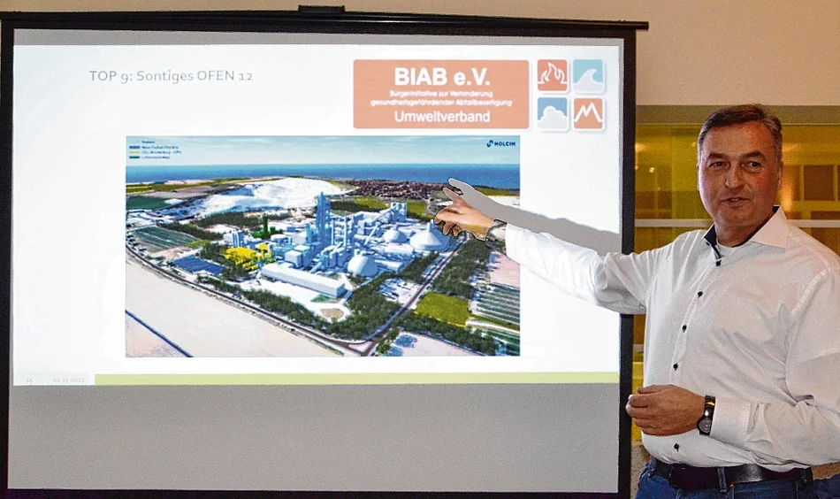 Ein zweites gravierendes Thema wurde der „Scoping“-Termin (Planungskonzeption) zum geplanten Ofen 12. Dieser soll ab 2025 gebaut und 2029 fertiggestellt werden. Damit will Holcim zum weltweit ersten CO2 -neuralen Zementwerk werden. „Erstellt wurde das Scoping-Papier vom Verein der deutschen Zementwerke, der im Lobbyregister des Deutschen Bundestages 2022 eingetragen ist“, so der Vorsitzende. Zugegebenermaßen solle ein großer Teil der dann im Betrieb nötigen Energie CO2 -neutral mit 100 Megawatt „grüner Energie“ produziert werden. „Das wäre im Grundsatz ein Riesenfortschritt, doch das Problem hier ist die große CO2 - Abscheidung. Das CO2 soll mit einer Pipeline nach Heide geleitet werden“, so Ehlers. Es soll dann zu E-Fuel verarbeitet und als „Sustainable Fuel“ für den Flugverkehr als Kerosin und Flugbenzin eingesetzt werden. „Damit wäre es dann ja wieder als Abgas in der Luft.“