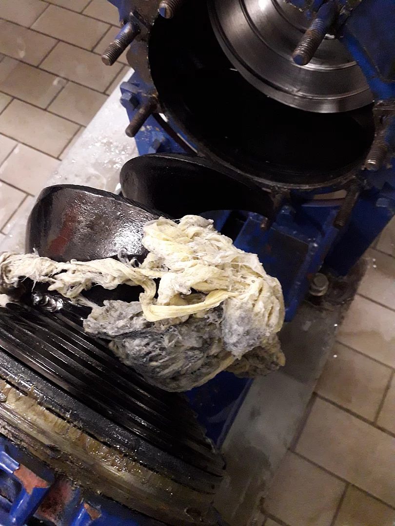 Klärwärter Thomas Hatje ist sauer! Wieder einmal bekam er am Wochenende eine Störungsmeldung auf sein Handy. Sauer war er aber nicht, weil er am Sonntag los musste, sondern weil es immer wieder dieselben Ursachen sind, die die Störungen verursachen. So hatten sich auch diesmal wieder Feuchttücher um die Laufräder der beiden Zulaufpumpen gewickelt. Durch die Rechenstäbe flutscht zwar einiges durch. Bei normalem Toilettenpapier ist das kein Problem: Das besteht aus Zellulose und löst sich in der weiteren Abwasserreinigung so stark auf, dass es für die Pumpen, die das Wasser im Klärwerk weiterleiten, keine große Rolle spielt. Feuchtes Toilettenpapier besteht dagegen nicht aus Papier, sonders aus reißfestem Vlies, also aus Textilfasern.