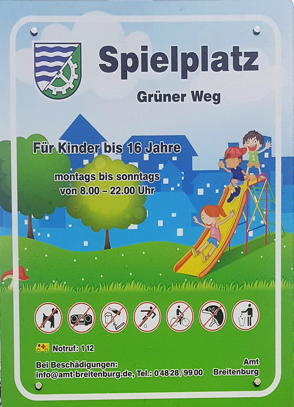 Die Gemeinde Lägerdorf hat ihre in die Jahre gekommenen Spielplatzschilder erneuert. Zusätzlich zu den bisherigen Inhalten ist jetzt auch der Standort des Spielplatzes aufgeführt, um im Notfall die schnelle Erreichbarkeit zu erleichtern. Um Beschädigungen und Mängel einfacher melden zu können, ist die Telefonnummer des Amtes Breitenburg aufgedruckt.