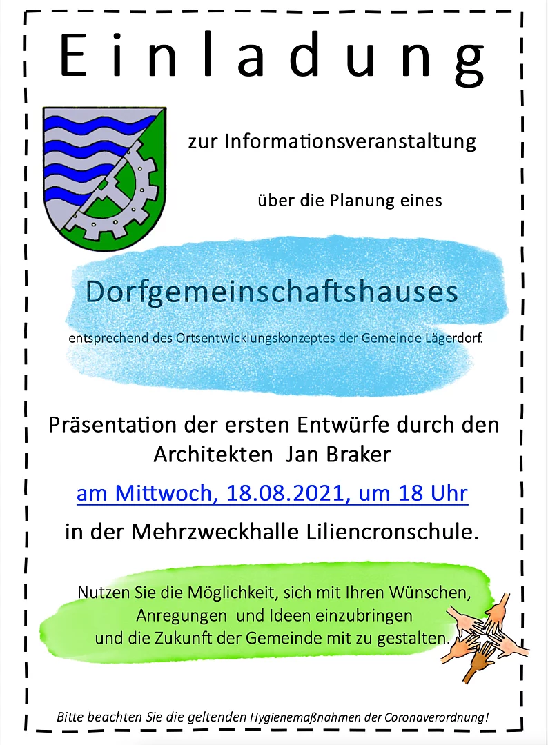 zu einer Informationsveranstaltung zum Ortsentwicklungskonzept (OEK) der Gemeinde zur Planung eines Dorfgemeinschaftshauses am Mittwoch, den 18.08.2021 um 18.00 Uhr in der Mehrzweckhalle Liliencronschule