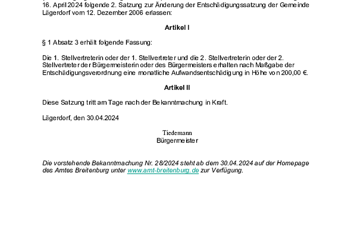 Die Freiwillige Feuerwehr Lägerdorf hat in ihrer Jahreshauptversammlung am 23.03.2024 Herrn Oliver Traeger zum stellvertretenden Wehrführer der Freiwilligen Feuerwehr Lägerdorf gewählt. Am 16.04.2024 hat die Gemeindevertretung diese Wahl einstimmig bestätigt und Herr Traeger wurde durch Bürgermeister Tiedemann unter Berufung in das Beamtenverhältnis als Ehrenbeamter für die Dauer von 6 Jahren zum stellvertretenden Wehrführer der Freiwilligen Feuerwehr Lägerdorf ernannt. Herr Traeger folgt auf…