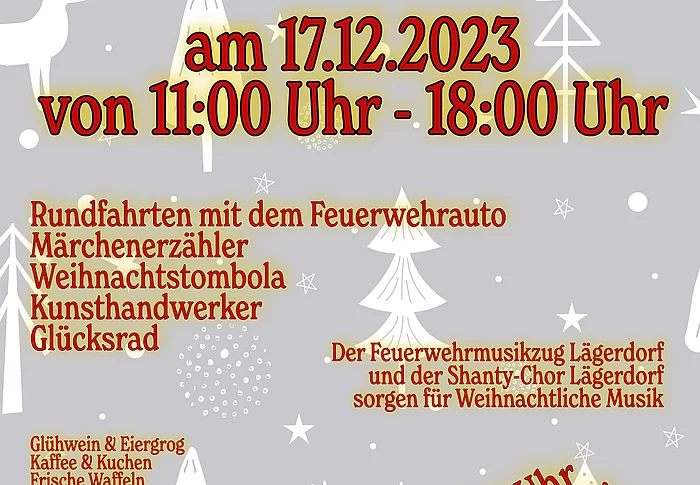 Am 17. Dezember, ab 11.00 Uhr findet an der Feuerwache wieder der traditionelle Weihnachtsmarkt statt. Die Veranstalter können mit zahlreichen Überraschungen aufwarten. Näheres entnehmen Sie bitte dem anliegenden Plakat.