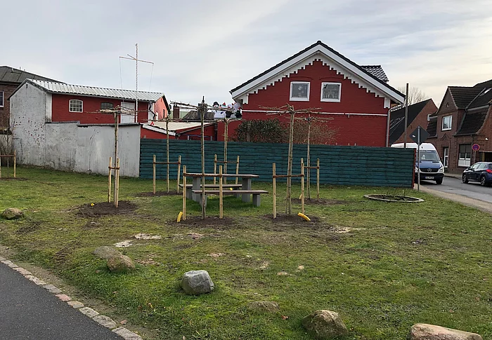 An der Ecke Rosenstraße / Mittelweg ist auf dem gemeindeeigenen Grundstück, auf dem in früheren Jahren der alte Konsum stand, eine Ruhezone entstanden, in der sich Spaziergänger ein wenig ausruhen können. Noch sieht es dort wenig attraktiv aus, doch im kommenden Frühjahr wird es dort hoffentlich ganz anders aussehen. Durch die gepflanzten Bäume soll später einmal ein "Grünes Dach" entstehen.