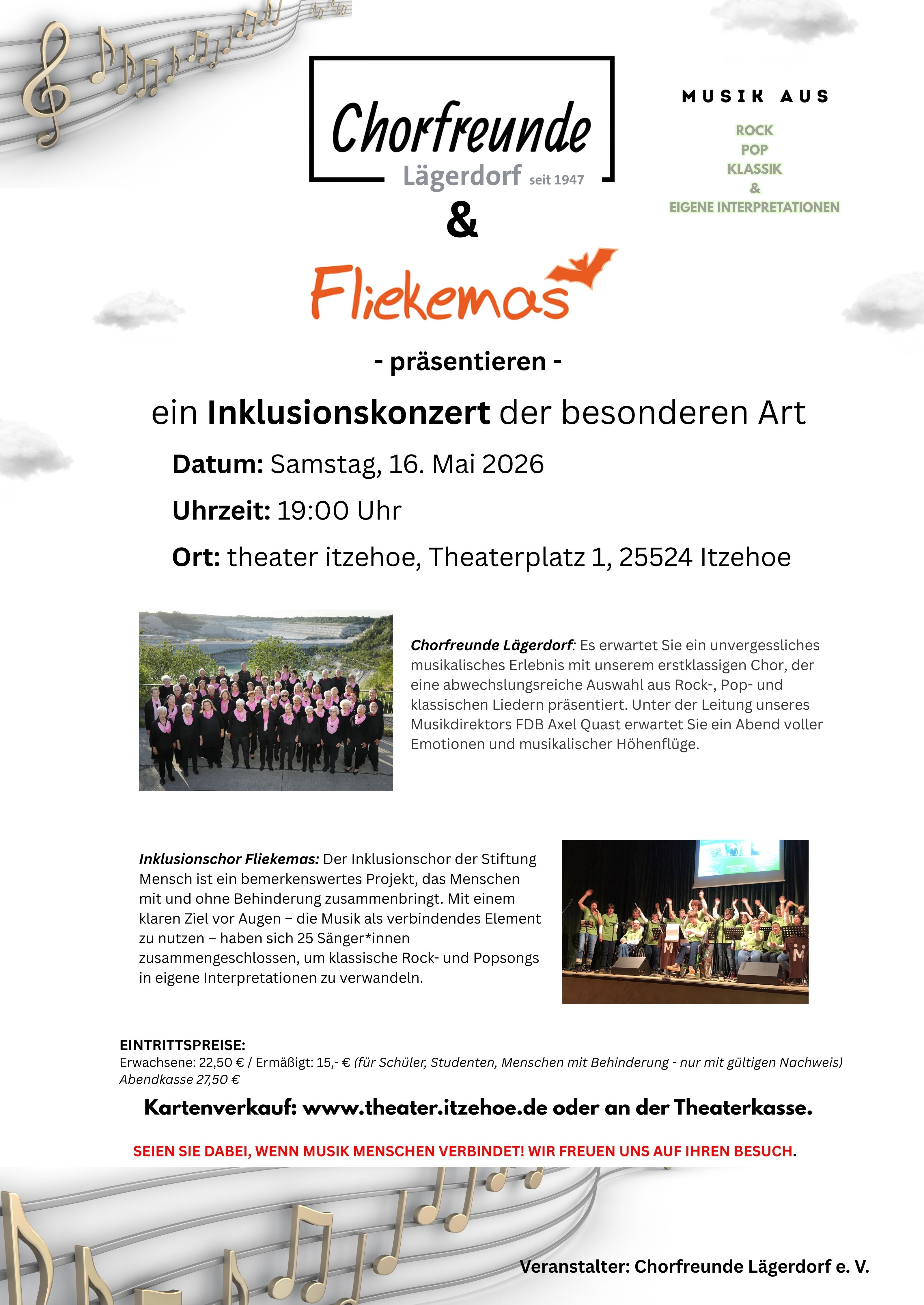 Am Samstag, den 16. Mai 2026 um 19.00 Uhr, präsentieren die Chorfreunde Lägerdorf und der Inklusionschor Fliekemas der Stiftung Mensch aus Meldorf im Theater Itzehoe ein Konzert der besonderen Art.